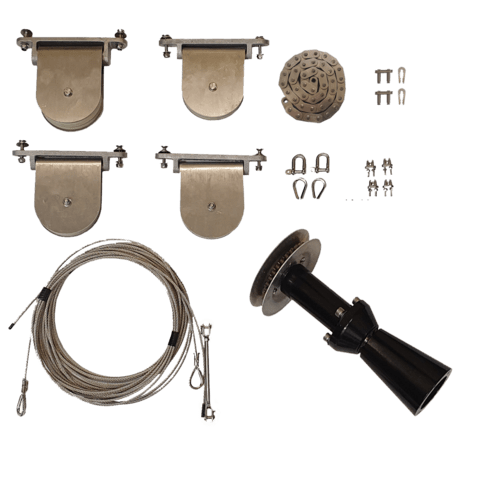 This complete kit comes with steering wheel, rope, chain, pulleys, helm set and everything else you need to set up a boat.